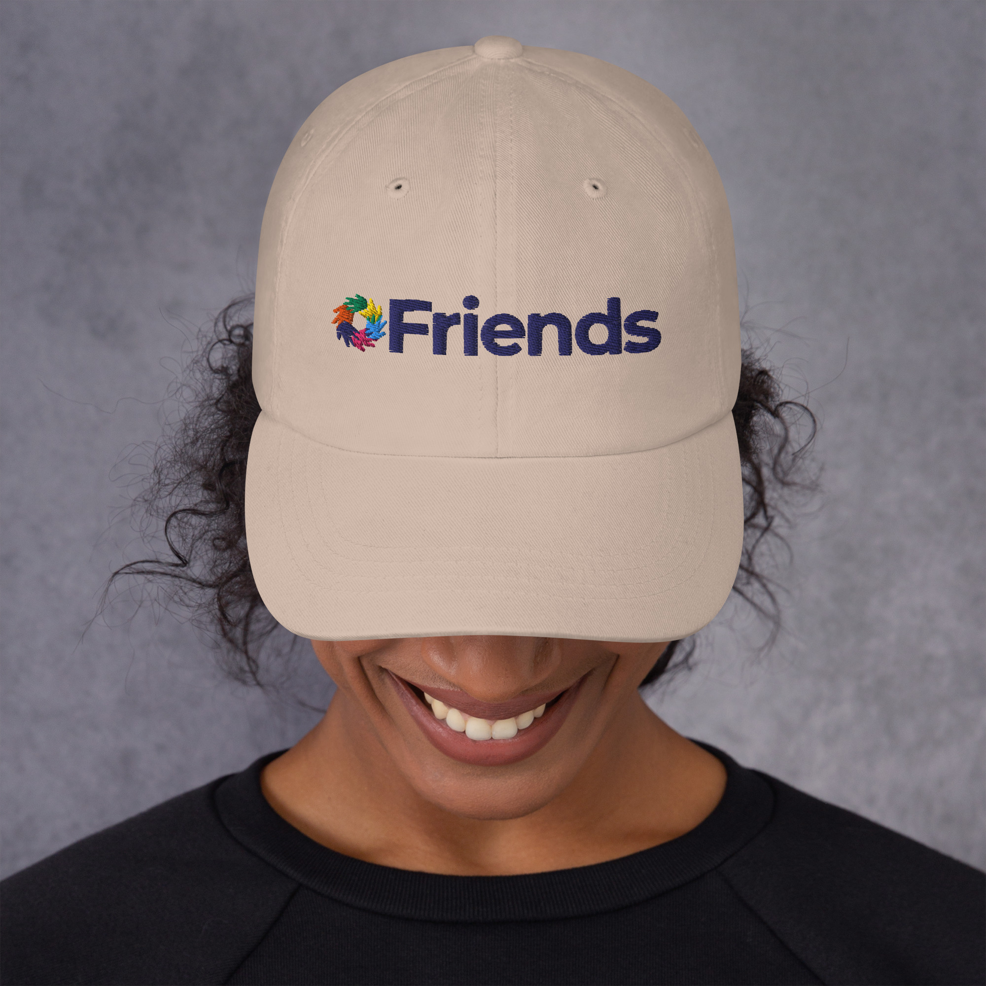 This embroidered hat has an adjustable strap and curved visor.
